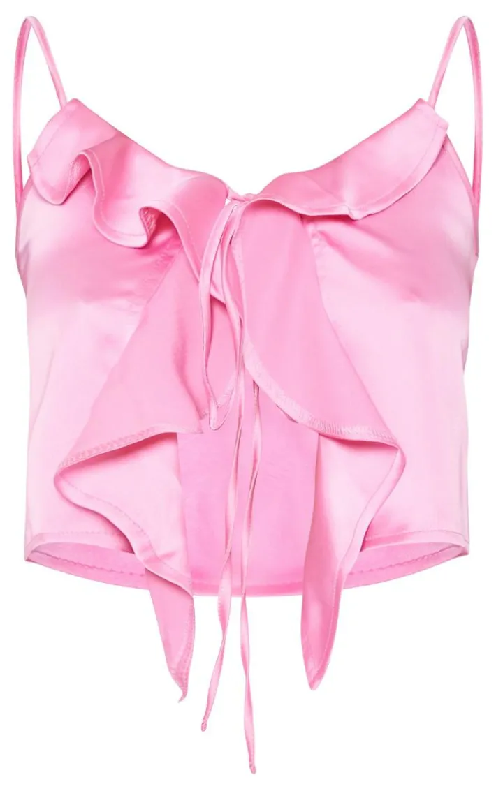 Channel all the glam vibes into your new season wardrobe with this tall hot pink satin frill detail cami top, you’re sure to have heads turning for all the right reasons in this statement piece. With a hot pink satin material, frill detailing and a cami style, you won’t be able to resist this tall top. Pair this satin top with the matching skirt, your highest heels and gold bangles for a fierce finish.