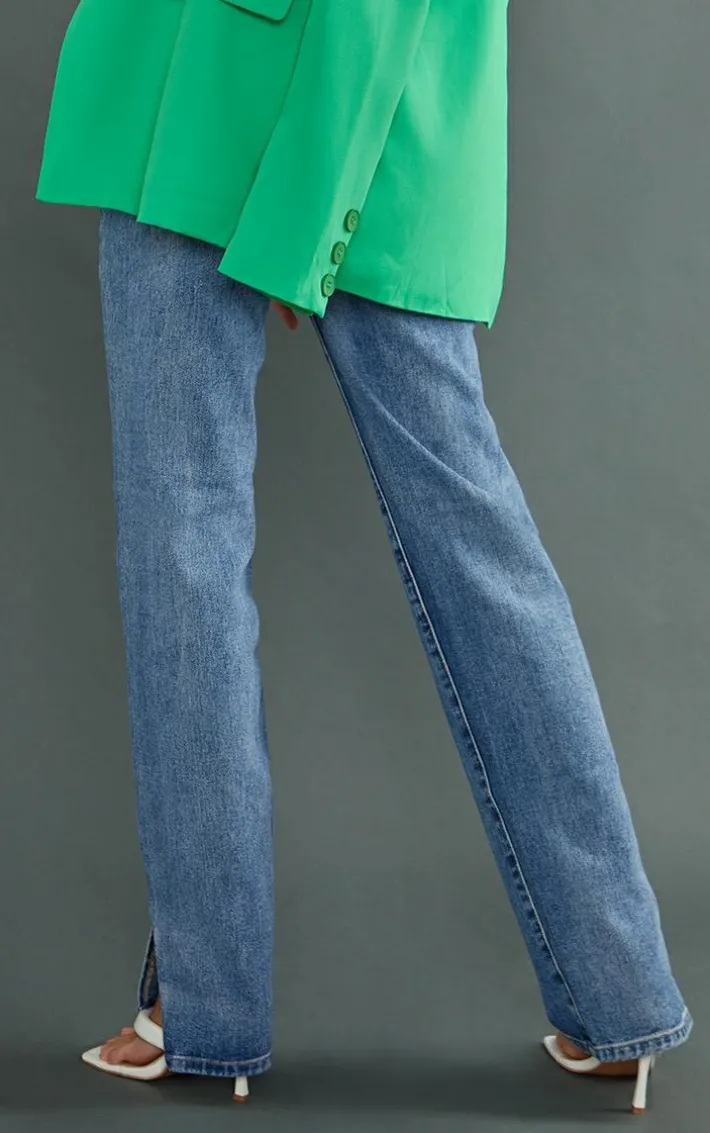 Jeans are the ultimate wardrobe staple and we are obsessing over this style. Featuring a mid wash denim material with a high waist fit and split hem detailing, we love these teamed with a crop top and a pair of strappy heels for drinksthis weekend.