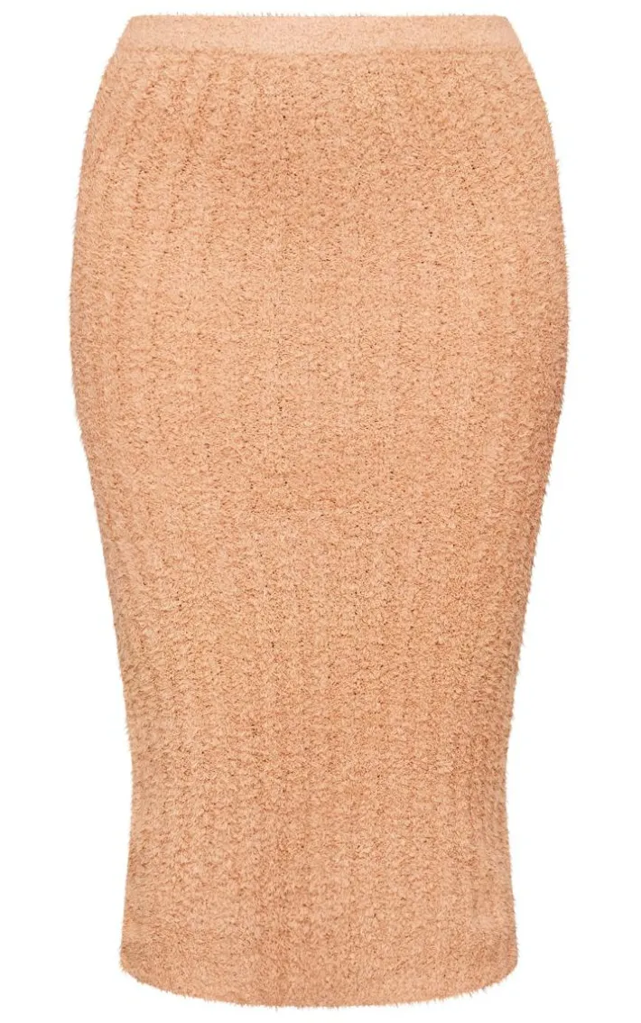 Bring all the cosy vibes to your outfit of the day with this tall tan fluffy knitted midi skirt. Made from a tan hue fluffy knit material with a figure-huggingmidi fit, what more could you want? Pair this tall skirt effortlessly with the matching top, knee length boots and a faux leather jacket for a simple yet chic everyday look that won’t go unnoticed.