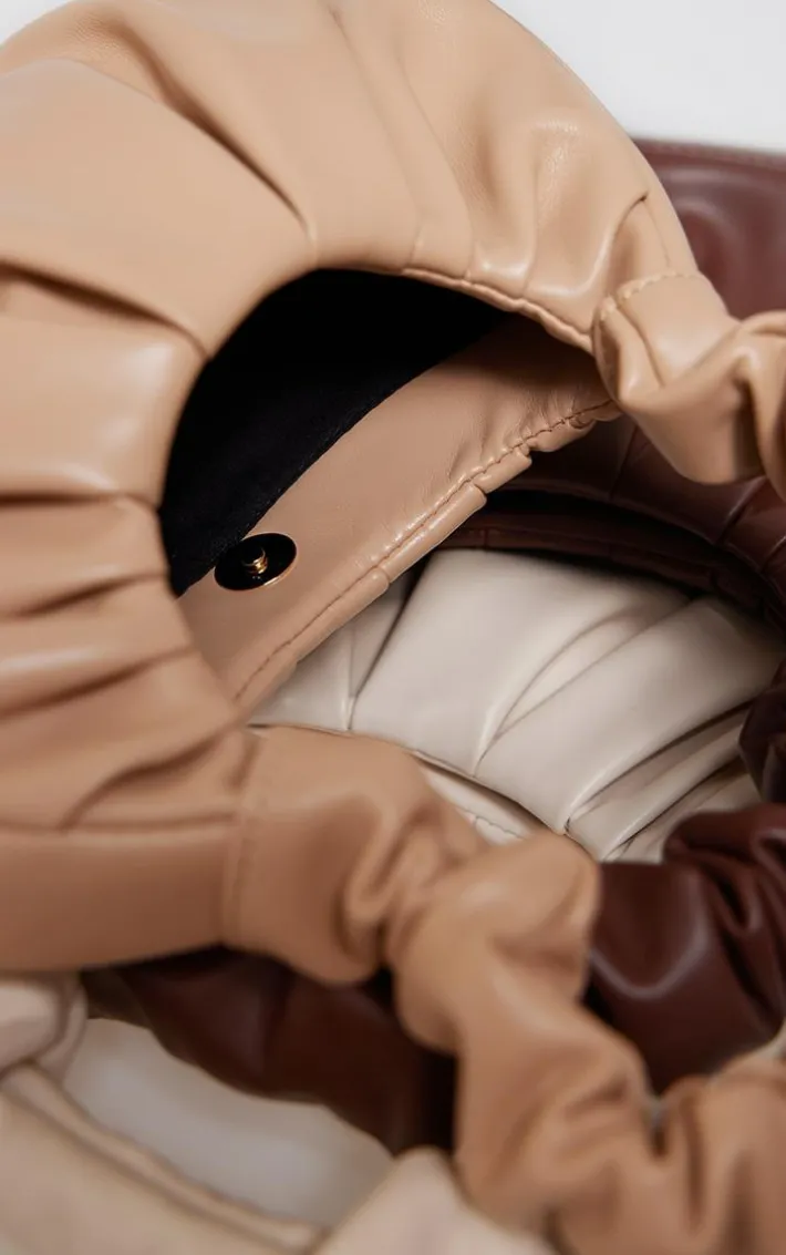 We are loving this on trend bag to take your look to the next level. Featuring a tan material with an extreme ruched handle detail, we’re obsessed.