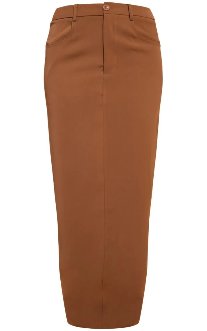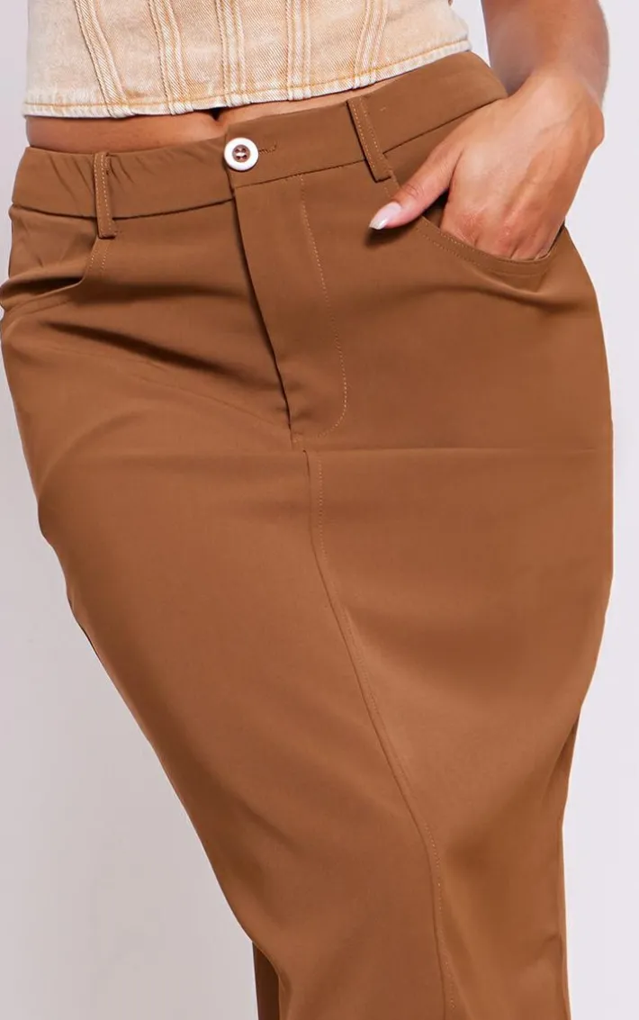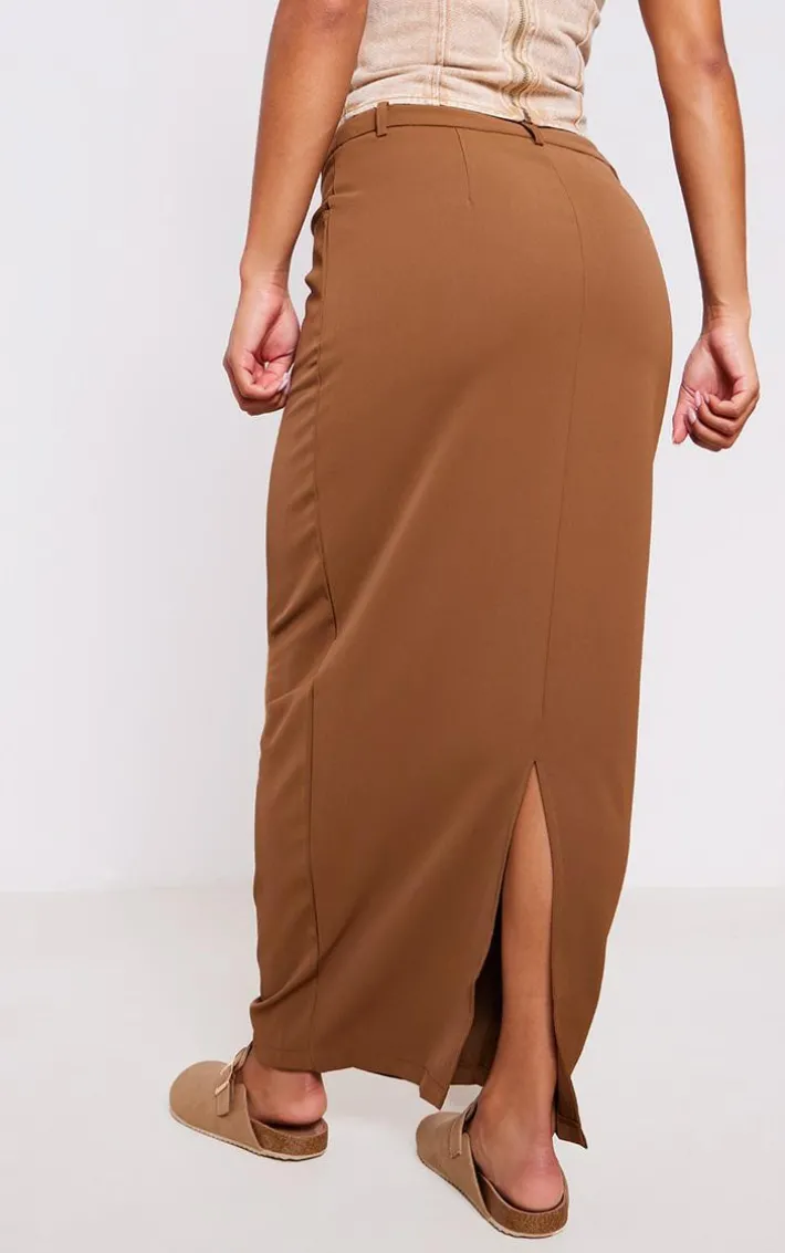 Level up your new season wardrobe essentials with this tan woven split back maxi skirt, you’ll be reaching for this must-have piece whatever your plans. This maxi skirt features a tan woven material with a split back design and a figure-flattering fit, what’s not to love? Style this maxi skirt with a corset top, mules and a faux leather jacket for a chic, weekend-worthy vibe.