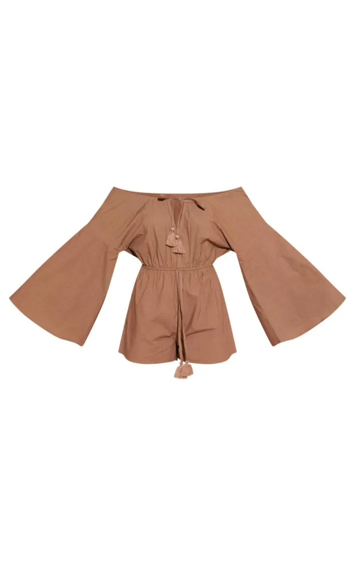 Be on trend this season with this taupe flare sleeve bardot romper. Brought to you in a taupe material with flared sleeves and a bardot design, you will bring all the edge to your outfit of the day. This romper is perfect for those on the go days. Team with western boots and gold accessories to be the Center of attention wherever you step foot this season.