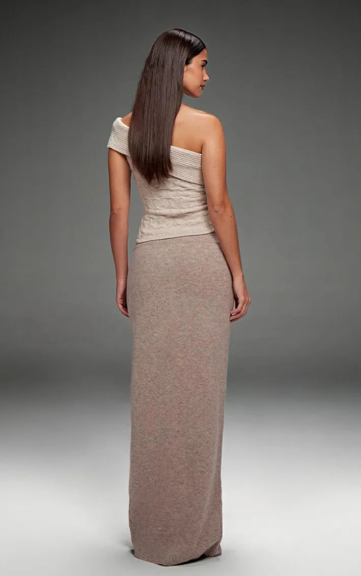 Elevate your look with this taupe melange soft knit maxi skirt is essential. This chic maxi skirt is brought to you in a taupe soft knit material with a melange design, we’re in love. Its maxi length gives you a flattering fit you won’t be able to resist. Why not team with an asymmetric knit top, slip on heels and simple accessories to complete the look everyone is talking about.
