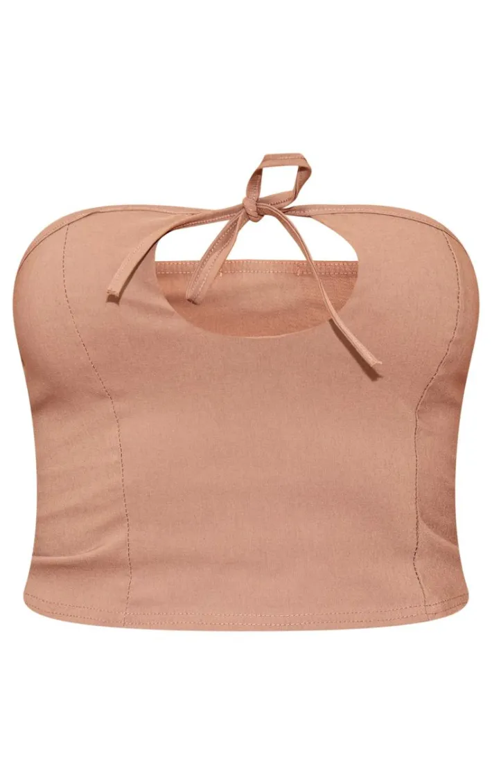 Amp up your weekend wardrobe with this taupe stretch woven tie detail seam top. Brought to you in a taupe stretch woven material with a tie detail and seam design, this top is calling your name. Style with the matching pants, heels and gold accessories for a figure-flattering fit.