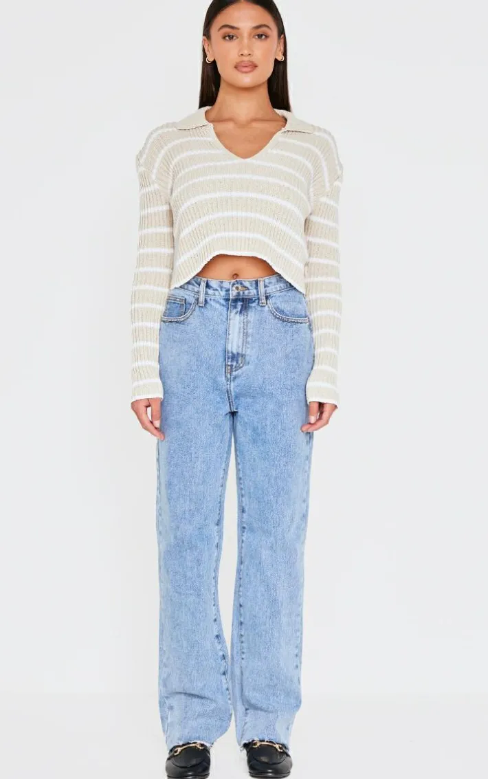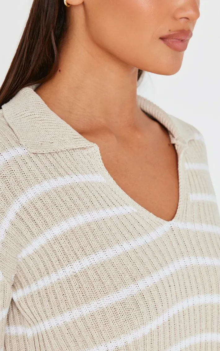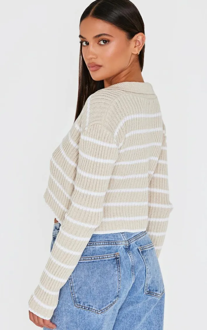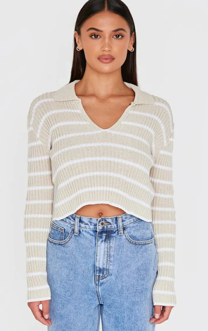 Elevate your everyday wardrobe with this taupe stripe rib knit V neck cropped polo. Made from a taupe stripe knit material with a V neckline and a cropped fit, how can you resist? Style this cropped polo with jeans, loafers and simple gold accessories for a look we just can’t get enough of.