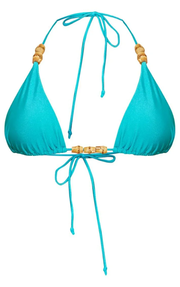 Get beach ready with this bikini top. Featuring a teal hue material with a triangle cup design and wooden bead detail. Wear with the matching bikini bottoms and statement accessories for a vacay look we’re loving.