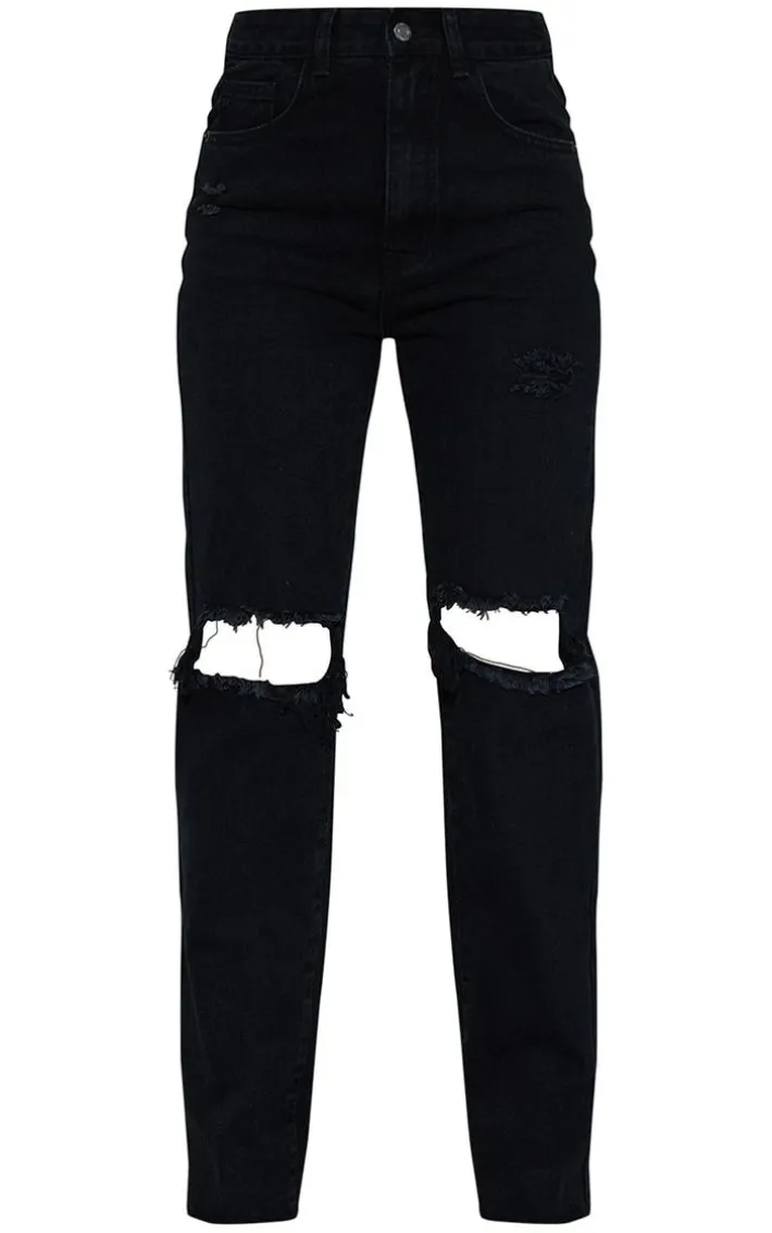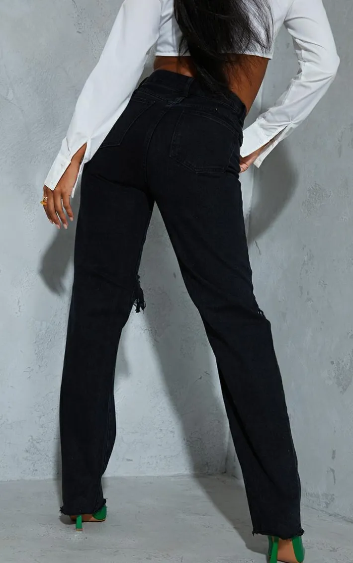 Nail major trends this season with these jeans. Featuring a washed black denim material with a high rise fit, ripped knee detail and a straight leg design. Style with a crop top and heels for a date.