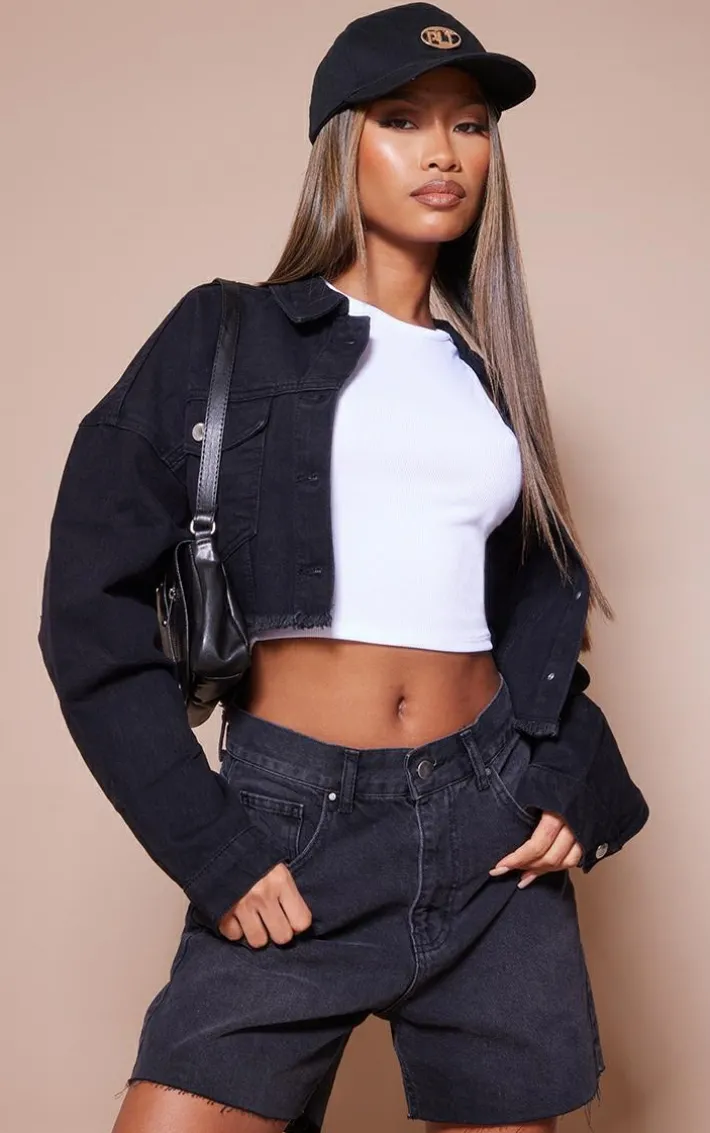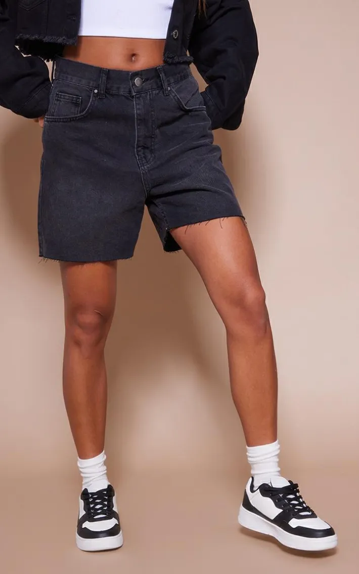 Give your wardrobe the update it needs with these washed black raw hem longline denim mom shorts. Made from a washed black material with a raw hem and a longline style. These mom shorts are perfect for taking any look from 0-100 instantly. Shop the look and add a black denim cropped jacket, cap and box-fresh kicks for a blogger-worthy combo.