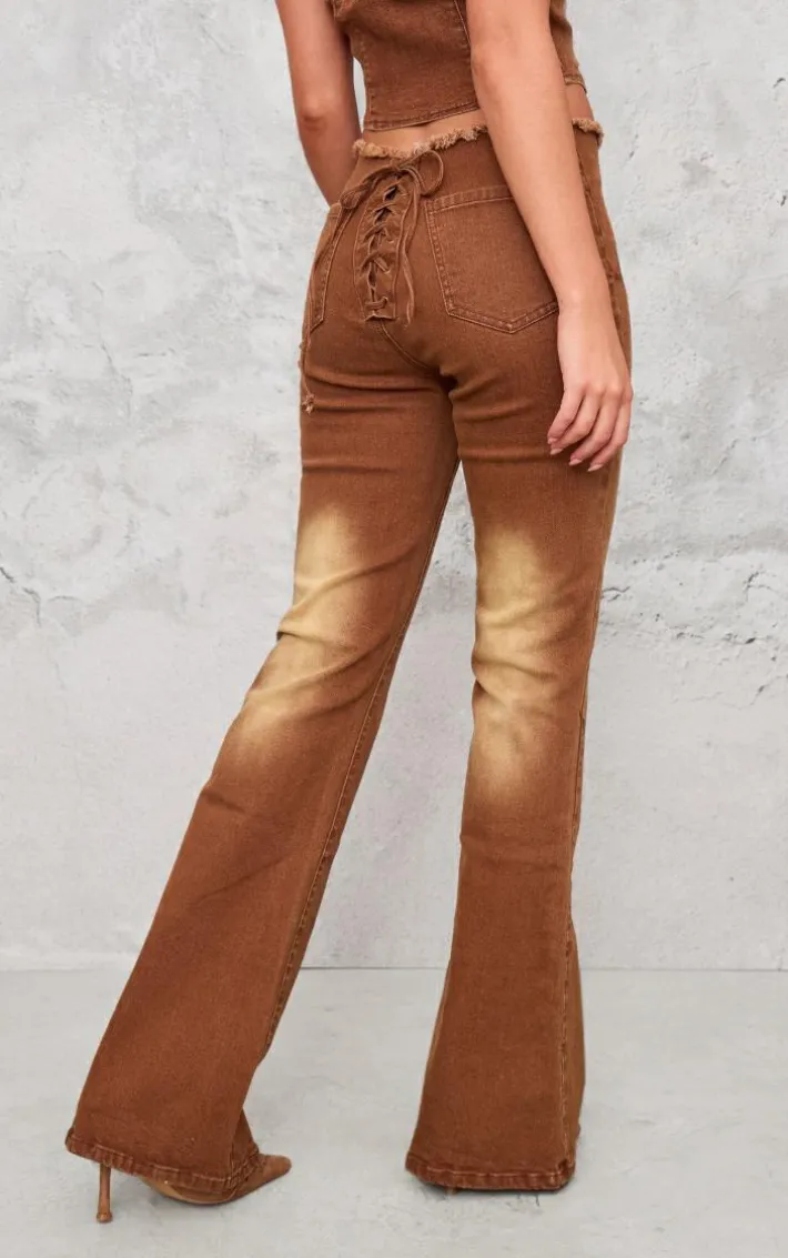 Bring all the edge with these washed brown lace up denim jeans. Brought to you in a washed brown denim material with a lace up design, what more could you want? These jeans are sure to have you setting major trends. Team with the matching top and a pair of shades to finish off the look we are loving.