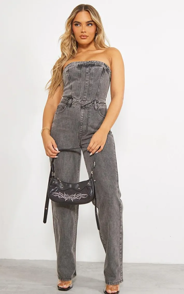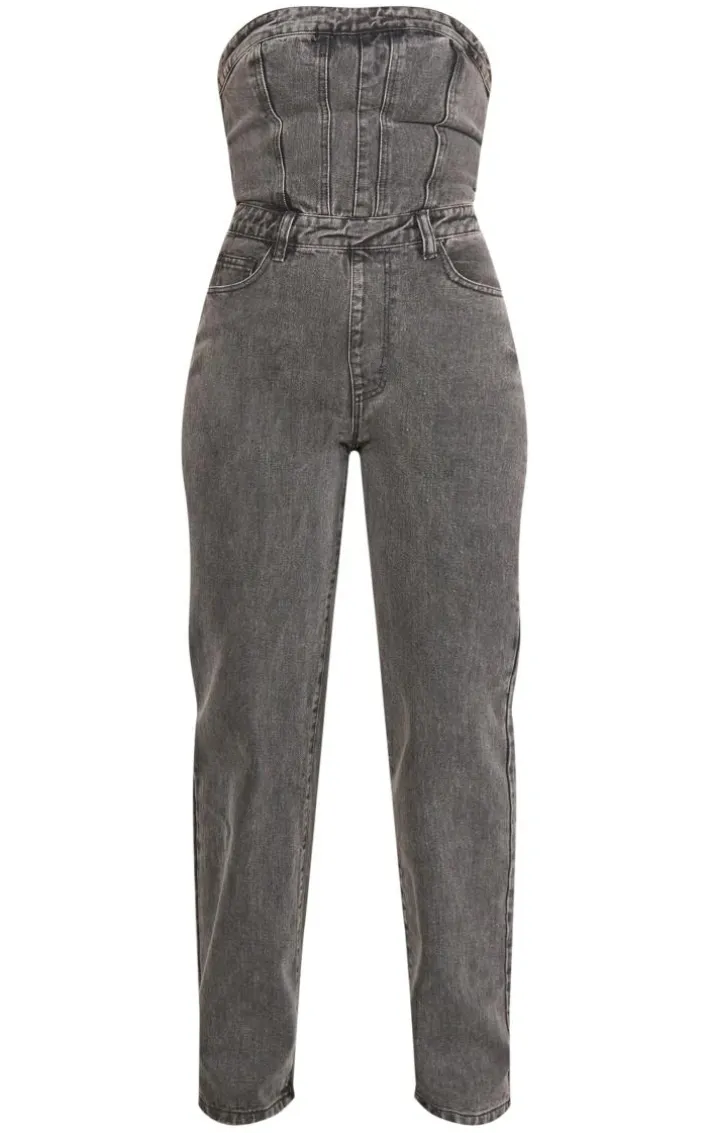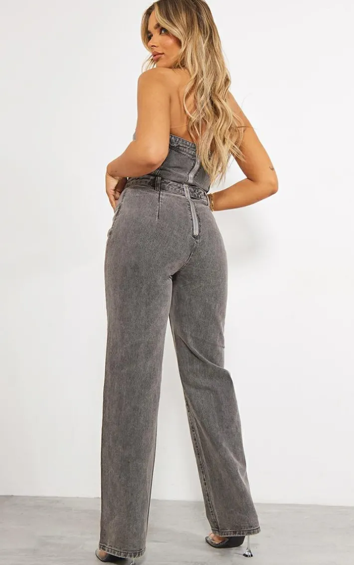 Get ready to turn heads for all the right reasons with this washed charcoal bandeau denim jumpsuit. Brought to you in a washed charcoal denim material with a bandeau design and pocket detailing, what more could you want? This denim jumpsuit is here to take the center stage in your weekend wardrobe doll. Style effortlessly with your dreamy high heels and statement accessories for a next-level look.