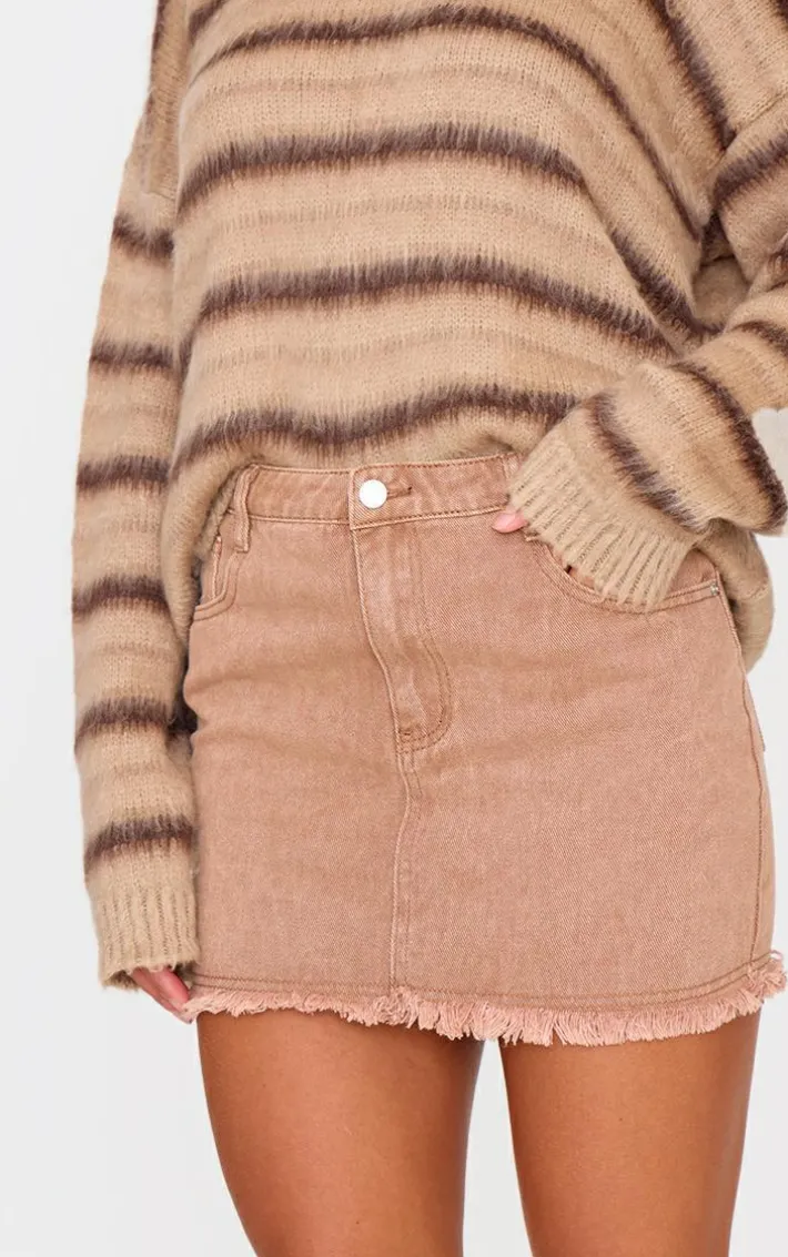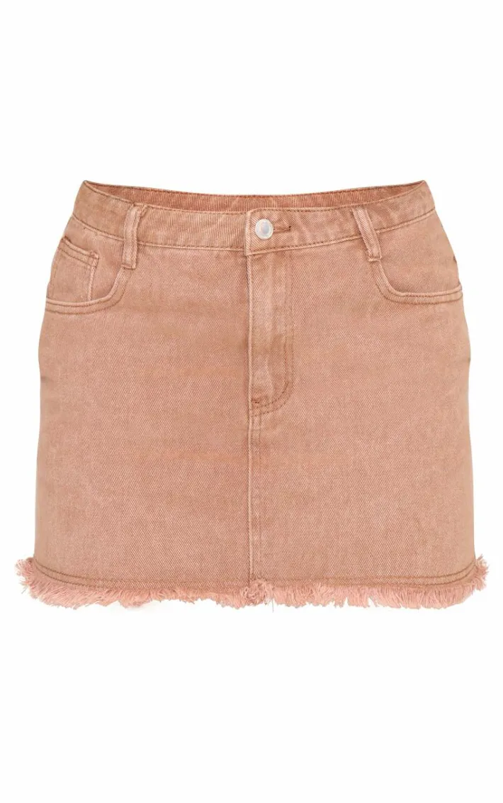 This washed taupe raw hem denim mini skirt is a must-have addition to your denim collection. Brought to you in an unreal washed taupe hue, a raw hem finish and mini skirt fit, it can be dressed up or down for your weekend ‘fit. Why not pair with a sweater and knee length boots for an everyday look we just can’t get enough of.