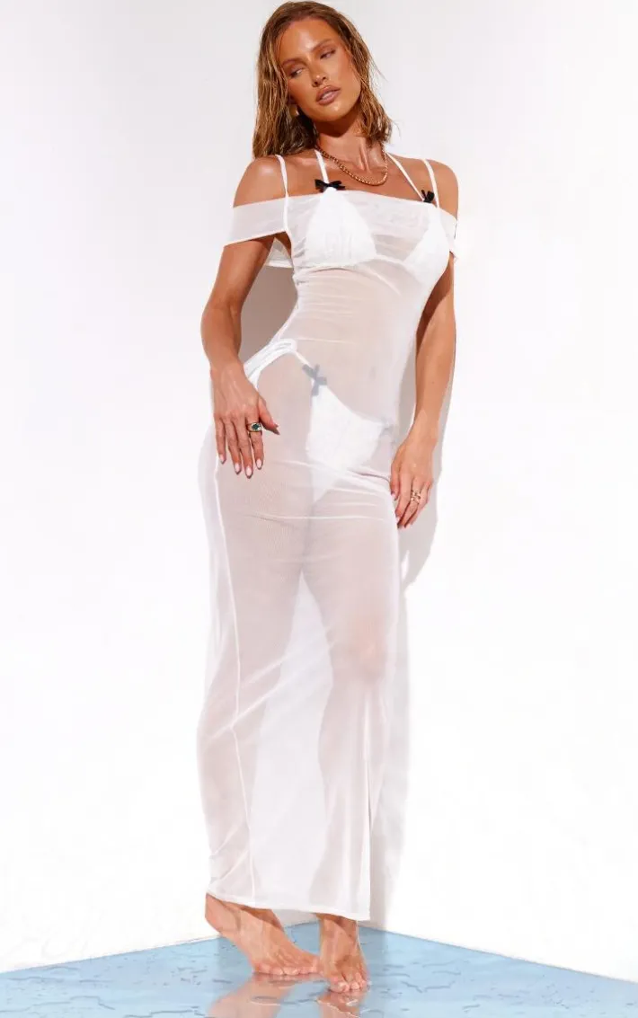 Turn heads for all the right reasons in this wite bardot cowl neck mesh maxi beach dress. Brought to you in a white mesh material with a bardot cowl neckline and maxi length, what’s not to love? Style this beach dress over a bikini set with sunnies and sandals for a dreamy finish.