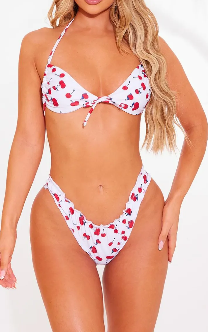 Inject some fruity print into your vacay wardrobe with this white cherry print ruched high leg bikini bottoms. Brought to you in a white cherry print material with ruched detailing and a high leg design, these are a must-have. Style these bikini bottoms with the matching bikini top and gold accessories for a sun-kissed look.