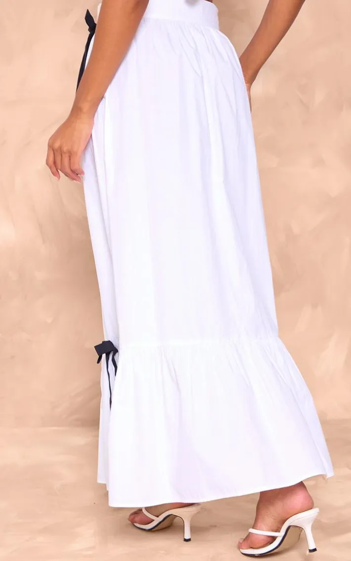 Make sure your new season look stays on point with this white cotton poplin bow detail maxi skirt. Brought to you in a white cotton poplin material with bow detailing and a flattering maxi fit, how can you resist? Style this maxi skirt withcrop top and simple gold accessories for a look that is sure to make heads turn wherever you go.