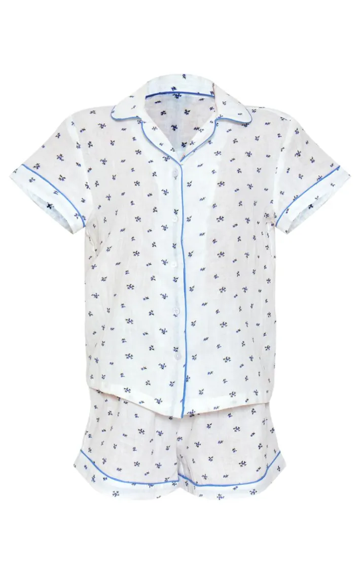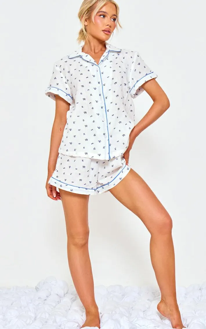 Take on your off-duty days the right way with this white dit’sy floral double gauze short sleeve shirt and short pj set. Made from a white double gauze material with a dit’sy floral print, this is everything we’re loving and more. With it’s short sleeve fit, this pj set is sure to have you feeling comfy all night long. To complete the look style this seamlessly with your fave accessories for a look that will secure you all the likes.