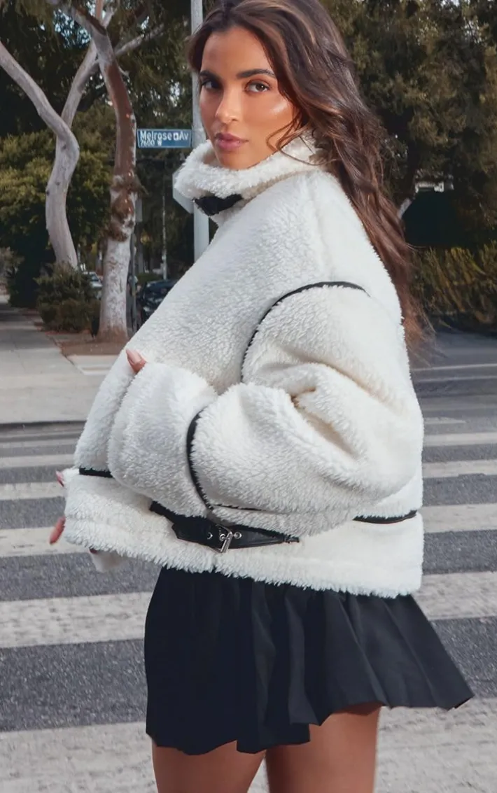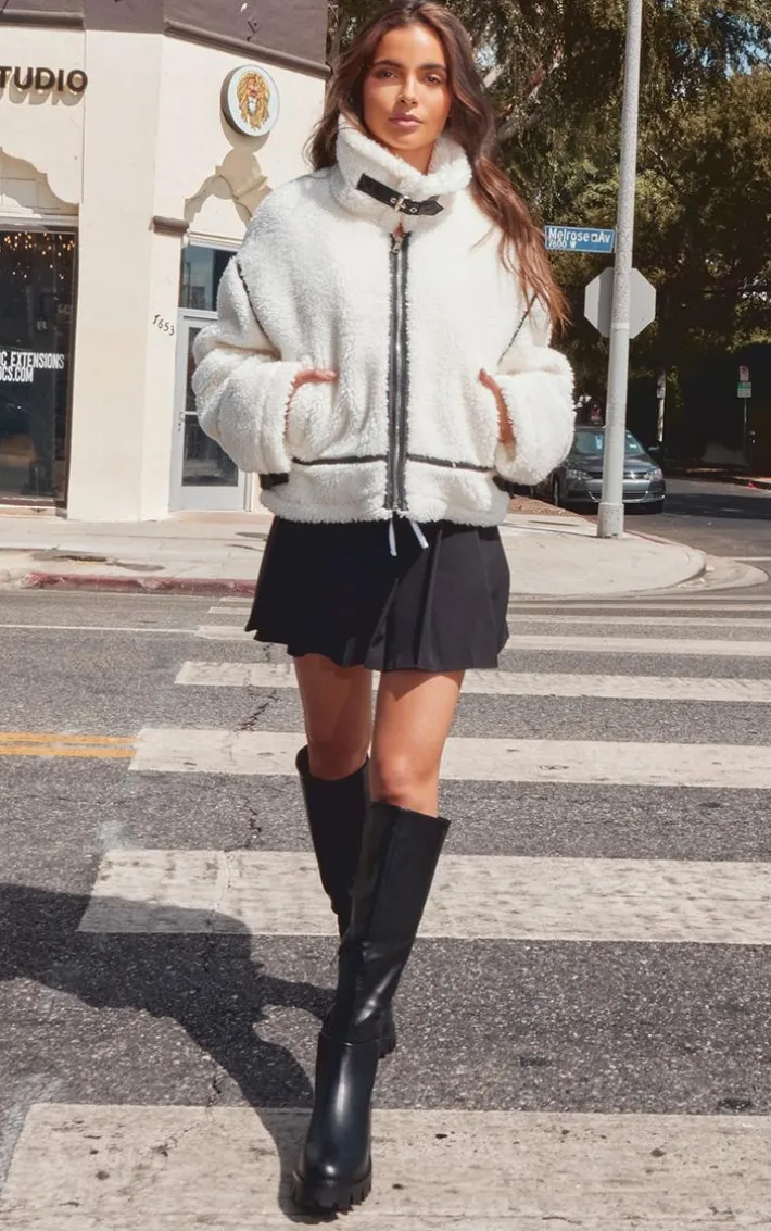 It’s official, we’re obsessed with this white faux leather contrast trim teddy aviator jacket. Brought to you in a white hue faux leather material with a contrast trim teddy detail, this aviator jacket is at the top of our wish list. Style with a pleated skirt, chunky boots and gold accessories for a cosy look we can’t get enough of.