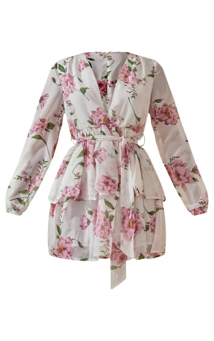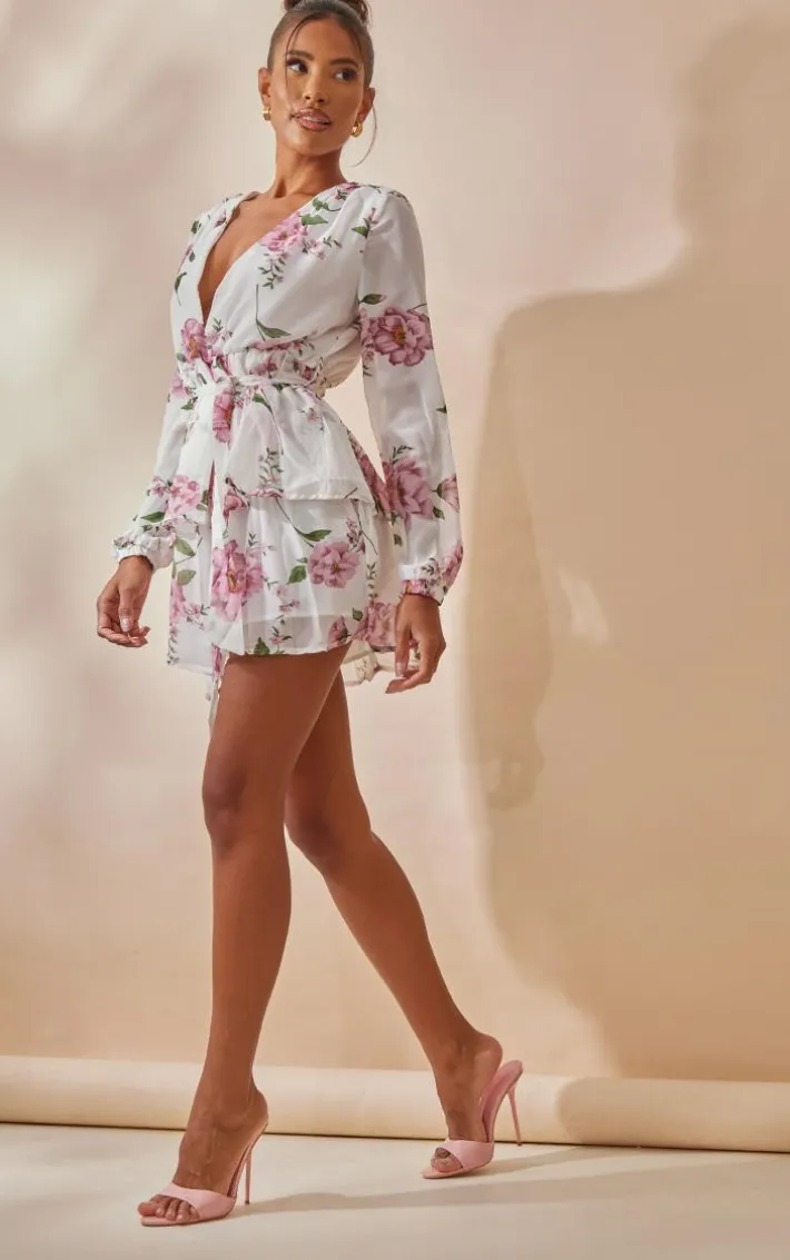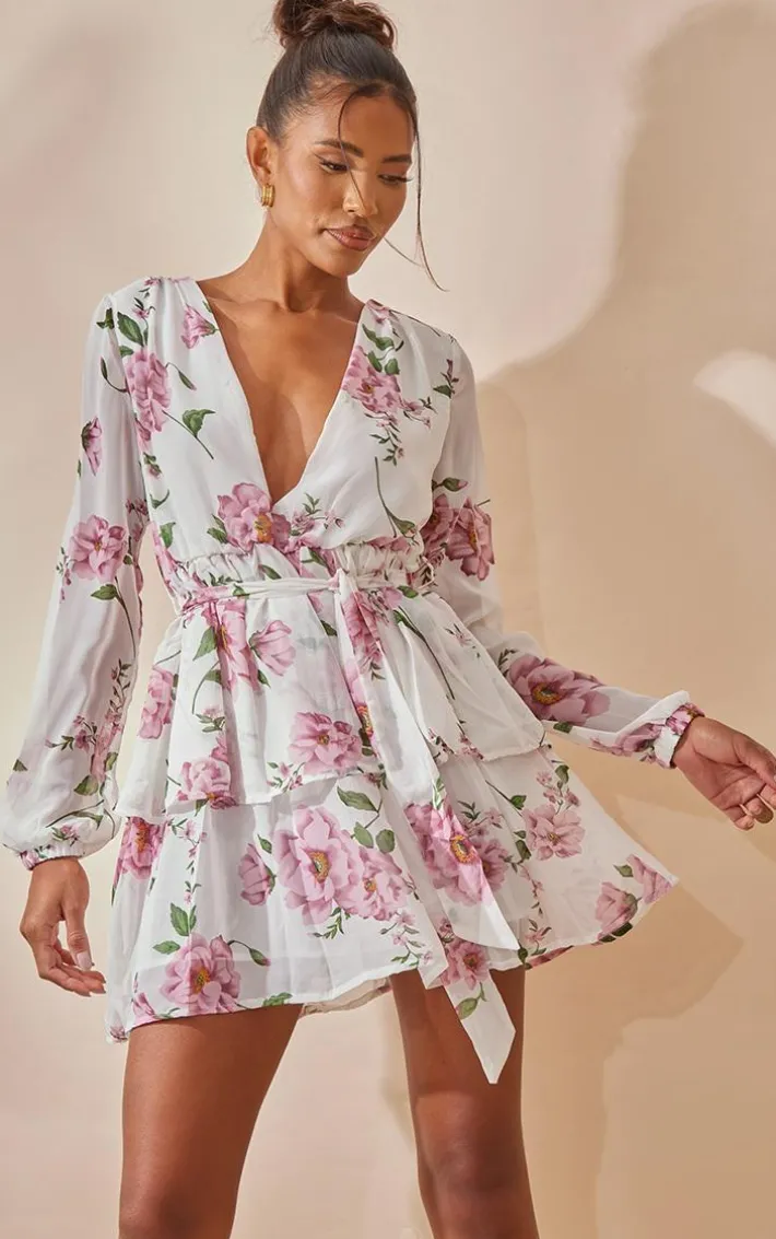This flirty and feminine skater dress is perfect for special occasions during the summer season. It features a white floral chiffon fabric with a plunge neckline, double tiered design and a tie waist, style this with statement earrings and heeled sandals.