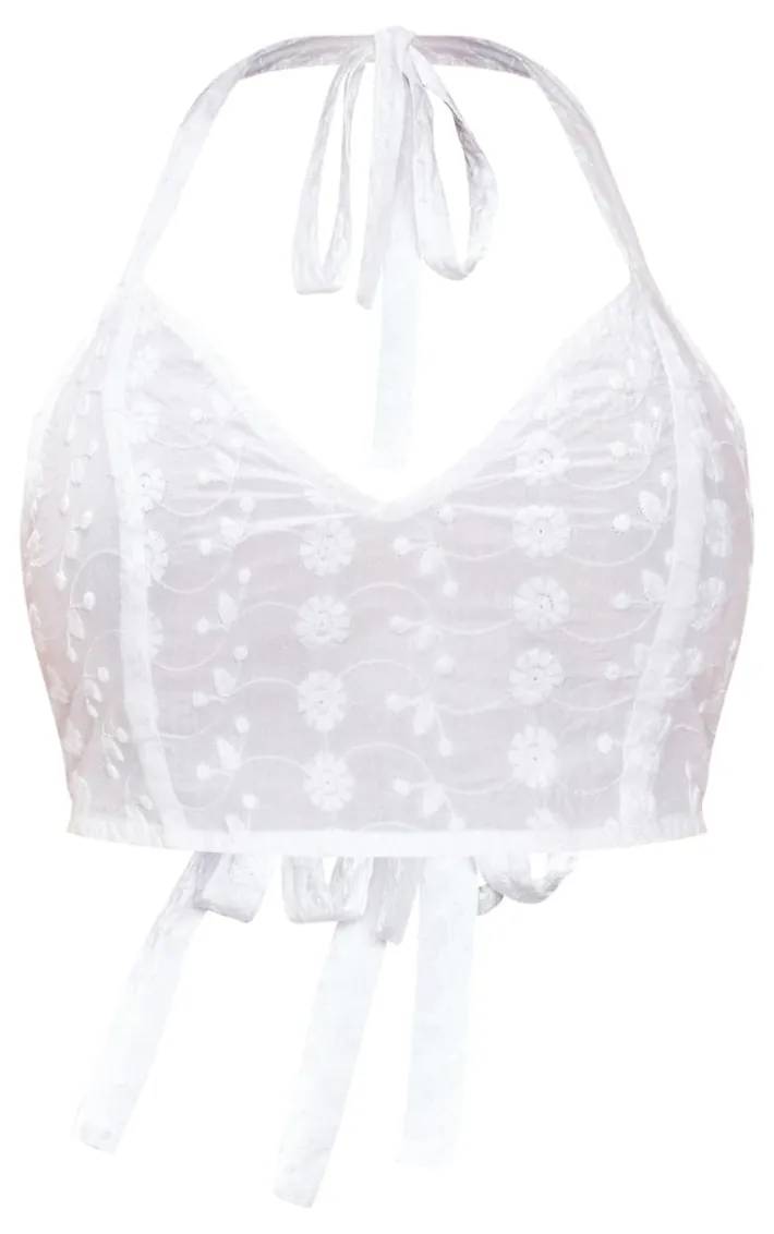 Work your styling techniques to make this white flower broderie halterneck crop top fit any occasion. Brought to you in a white material with a flower broderie detail and halter neck, how can you resist? Style this crop top with the matching skirt, cowboy boots and gold accessories for a flattering fit.