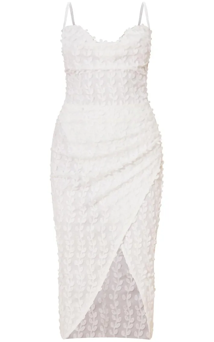 This must-have white cocktail dress is sure to have all eyes on you. Featuring a white lace material with a cowl neckline, split detailing, and lace-up back design, what’s not to love? Team this midi dress with gold accessories and barely-there heels to elevate the look.