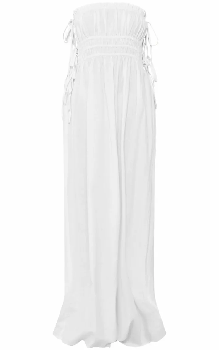 Add some chic to your look with this white linen look elasticated tie bow maxi dress. This maxi dress is brought to you in a white linen look material with an elasticated tie design and bow detail, how could you say no to this? This dress with its floor sweeping length will have all eyes on you. Style this dress with sandals and a shoulder bag for a flawless finish.