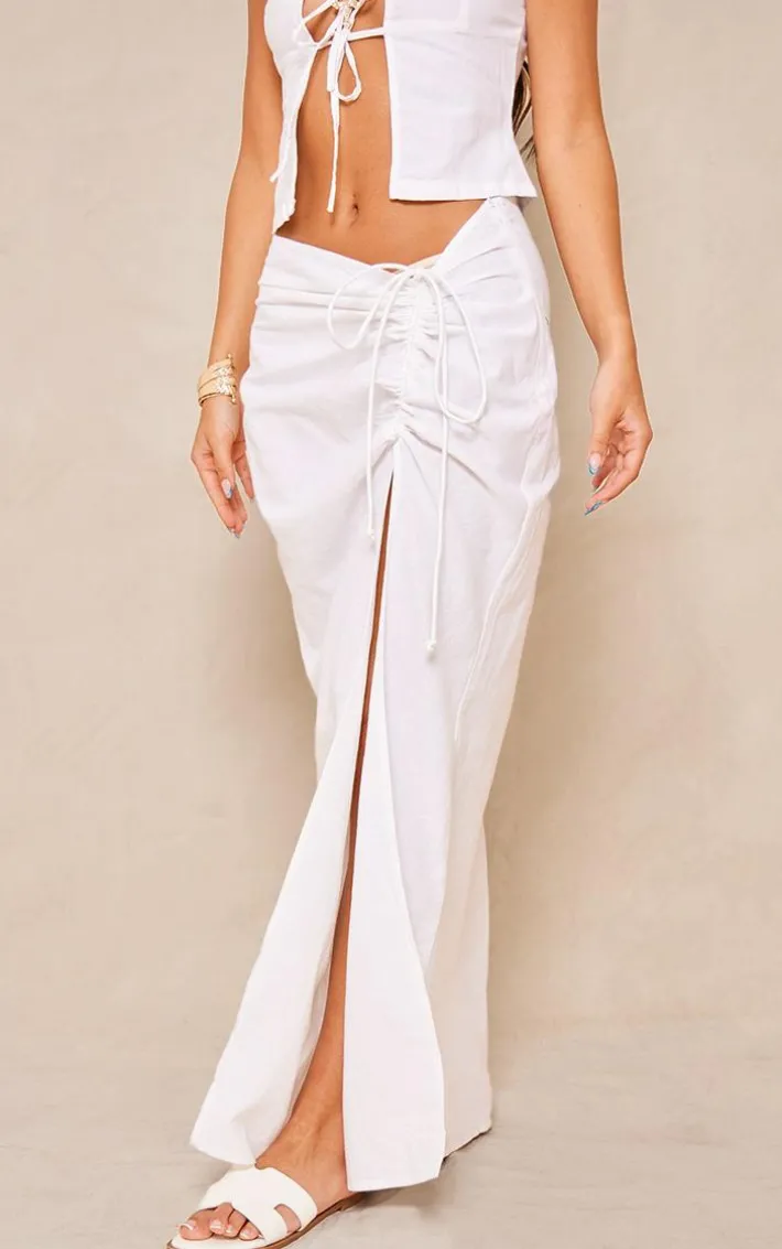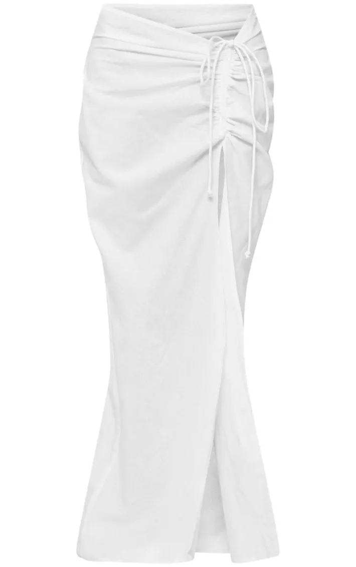 Turn heads for all the right reasons in this white linen ruched maxi skirt. Brought to you in a white linen material with a ruched design, what’s not to love? This maxi skirt is all you need to stand out from the rest. Team with your fave accessories and a pair of sandals to finish off the look we are loving.