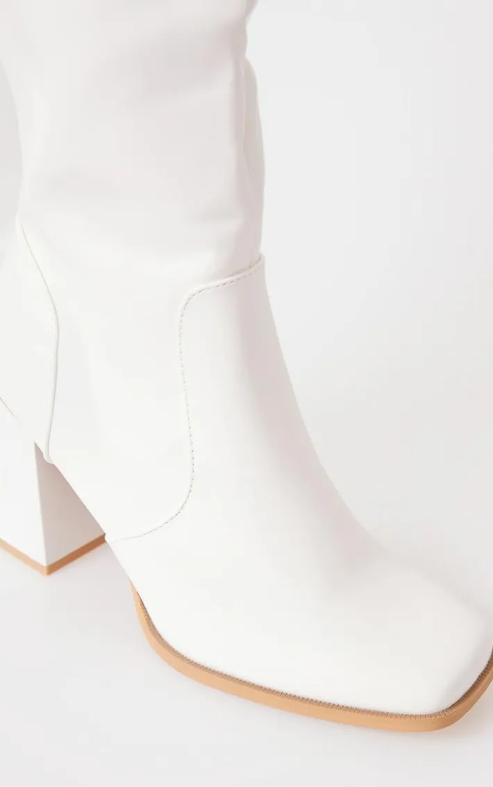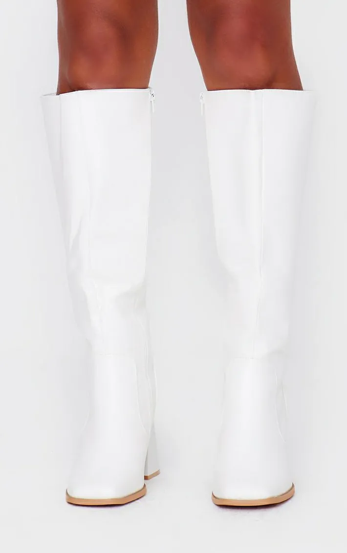 Step into the new season in style with these white PU square toe flare block heel knee high boots. Brought to you in a white hue PU material with a square toe design, flare block heels and a knee high style, how can you not fall in love? Style these white boots with your weekend look for a statement finishing touch.