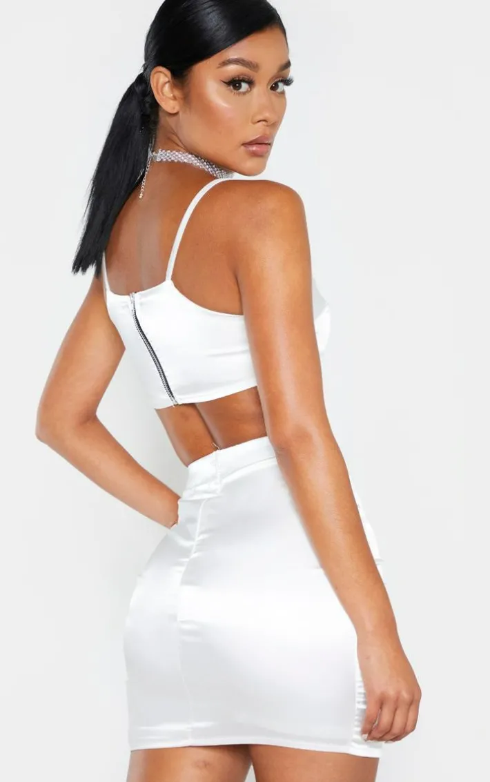 Double up on satin this weekend with this crop top and the matching skirt. Featuring a white satin material with a scoop neckline and a zip fastening, team this crop with the matching skirt and complete the look with high heels and a statement choker.