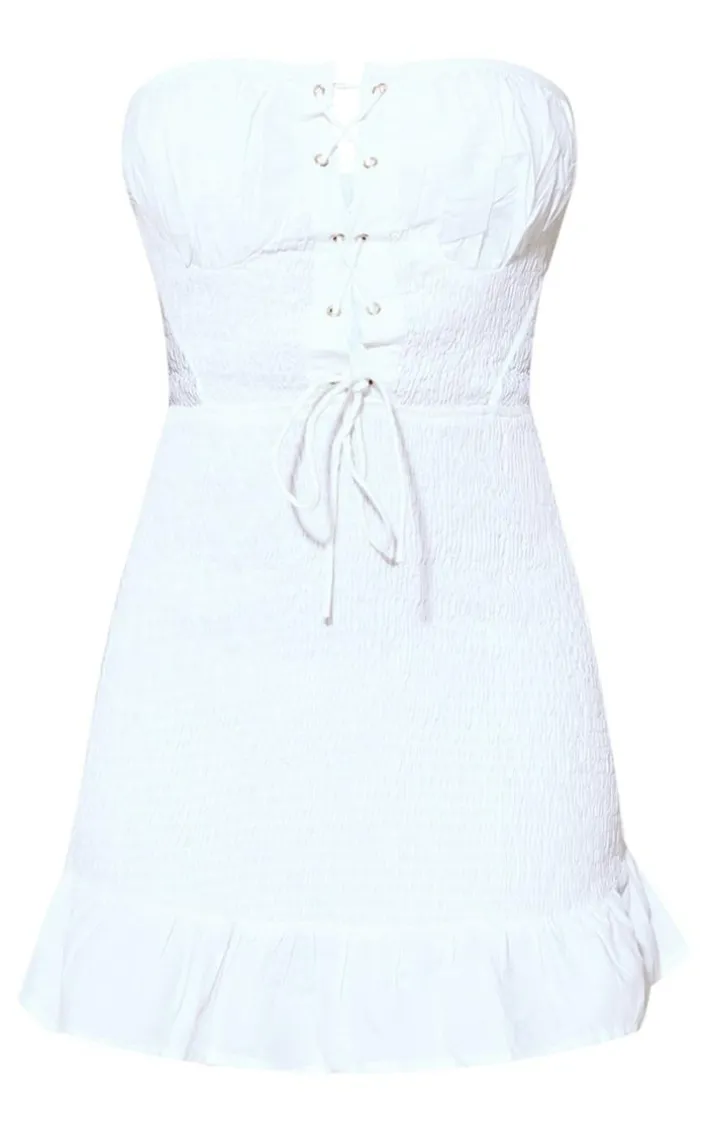 This season a white shirred bandeau lace up detail shift dress is essential and we are loving this style. This dress is made from a white shirred material with a bandeau design for an insta-worthy look we are obsessing over. This shift dress has a lace up detail for a touch of luxe we can’t get enough of. Team with some gold hoops and a pair of heels to complete the look everyone is loving.