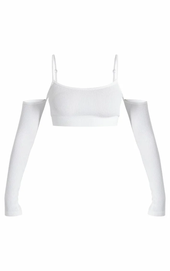 Add a little edge to your outfit of the day with this top. Featuring a white ribbed material with a cold shoulder design and a cropped length. Style with statement hue bottoms, fresh kicks and your fave accessories for the perfect off-duty fit.