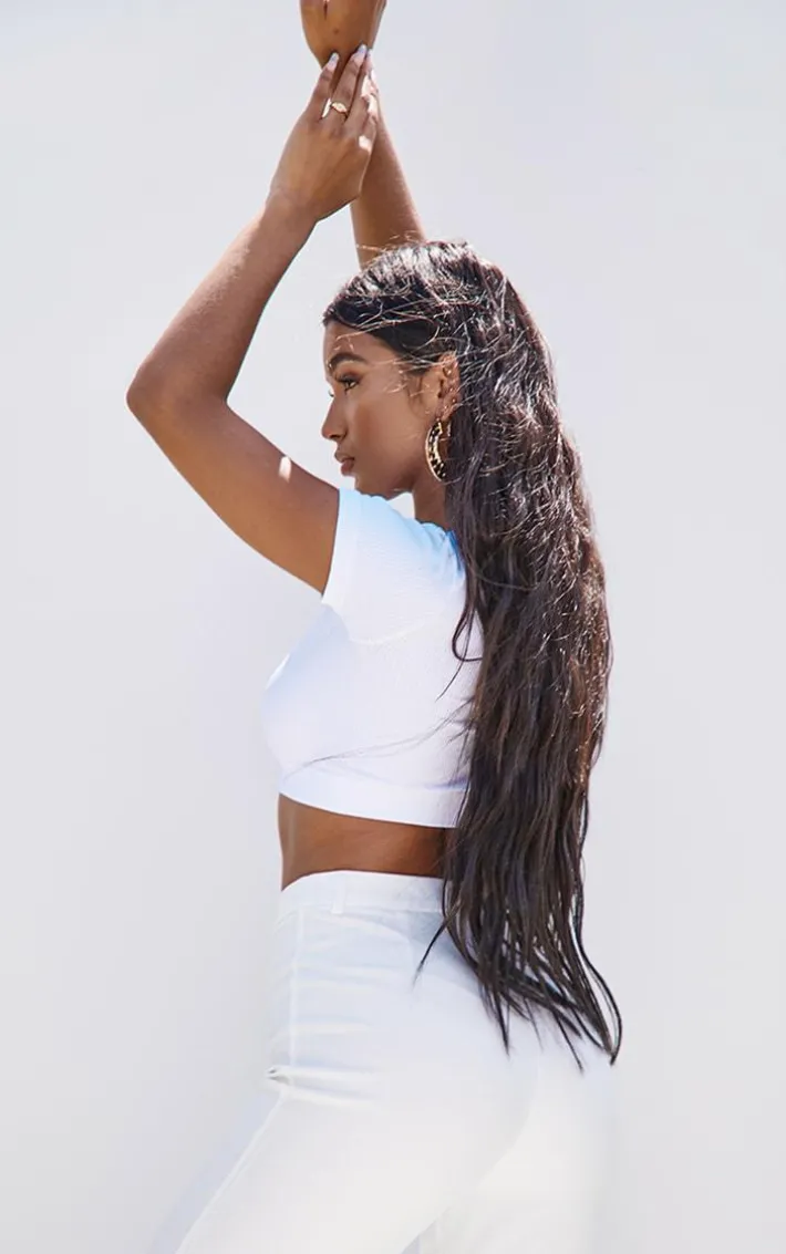 This simple yet chic top is perfect for styling with your existing wardrobe. Featuring a white snatched rib material with a neck band detail, short sleeves and a cropped fit. Wear this with matching hue bottoms and flatform sandals for a chic finish.