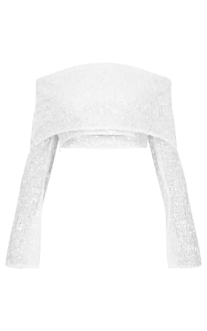 Make heads turn in this white textured sequin foldover bardot top. Brought to you in a white textured material with a foldover bardot neckline and sequin detailing for that extra touch of luxe, we are obsessed. pair this white top with the matching skirt and heels for a weekend-worthy look to be remembered.