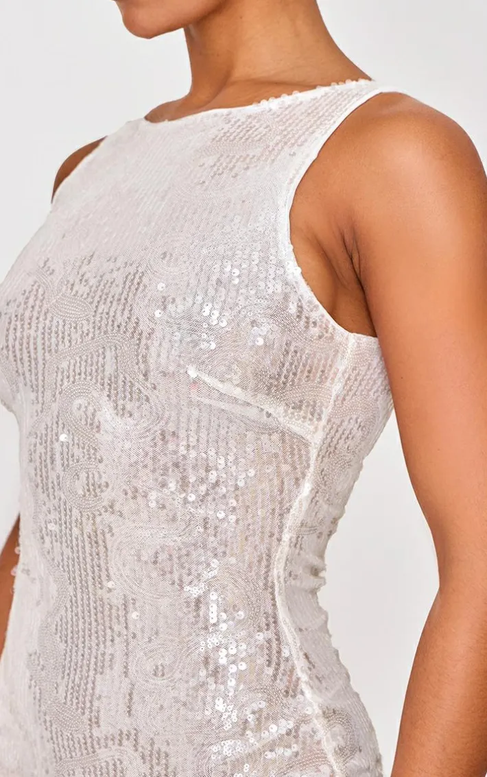 Steal all the attention in this white textured sequin racer neck maxi dress. Made from a white hue textured material with a sequin detail and racer neckline, this maxi dress is sure to elevate your new season wardrobe. Style with silver heels and accessories for a statement finish that won’t go unnoticed.