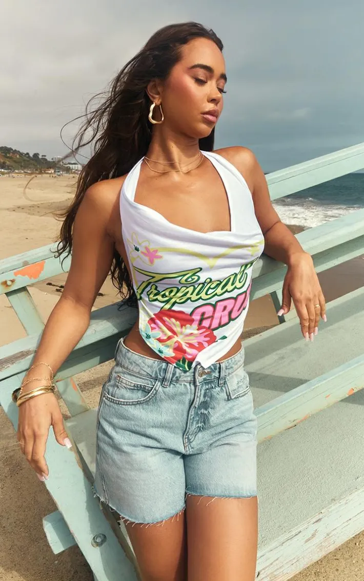 Take your new season wardrobe that extra mile with this white tropical print cowl crop top, we just can’t get enough. This top features a white material with a tropical print and a cowl neck design. Just add denim shorts, sneakers and simple accessories for a look no one will forget.