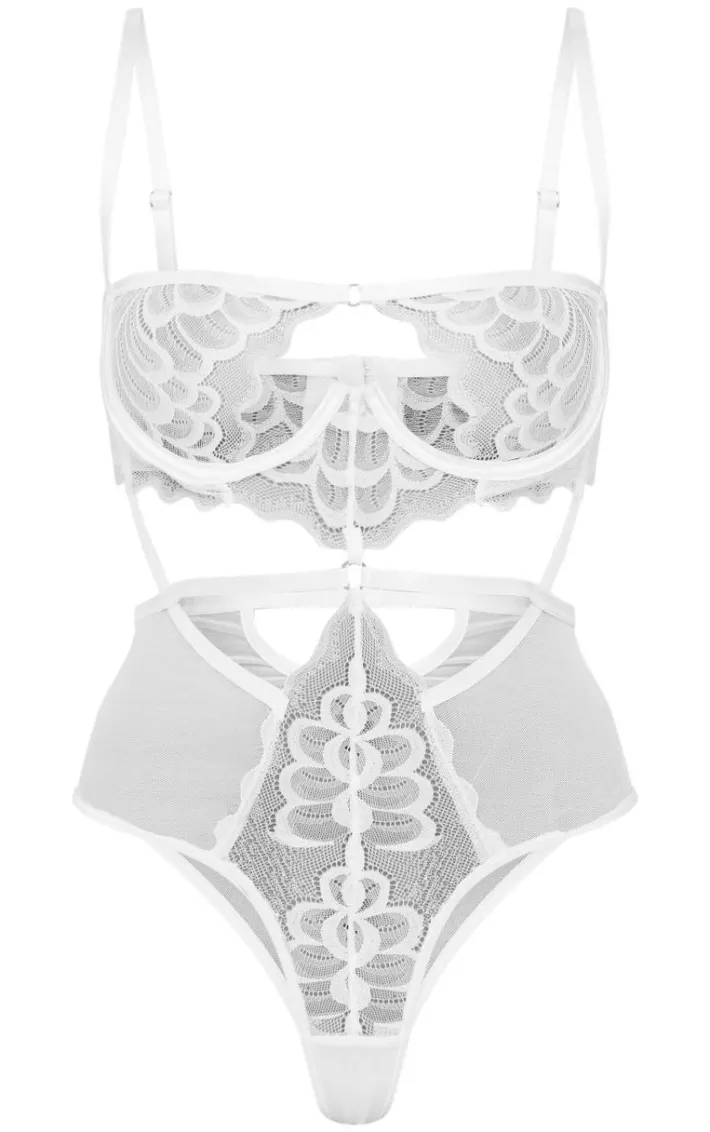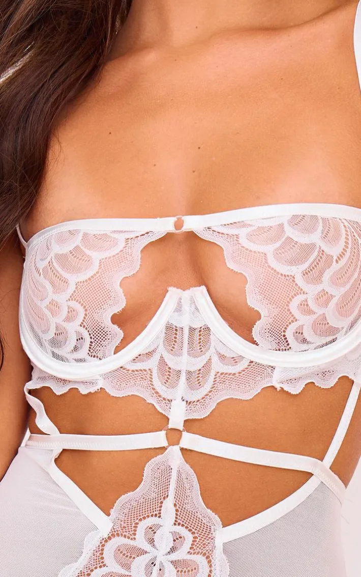 Look all kinds of glam in this white underwired cut out lace bodysuit. Brought to you in a white hue lace material with an underwired design and cut out detail, this bodysuit is everything you need and more. Style with cosy socks and a robe to get hearts racing this season.