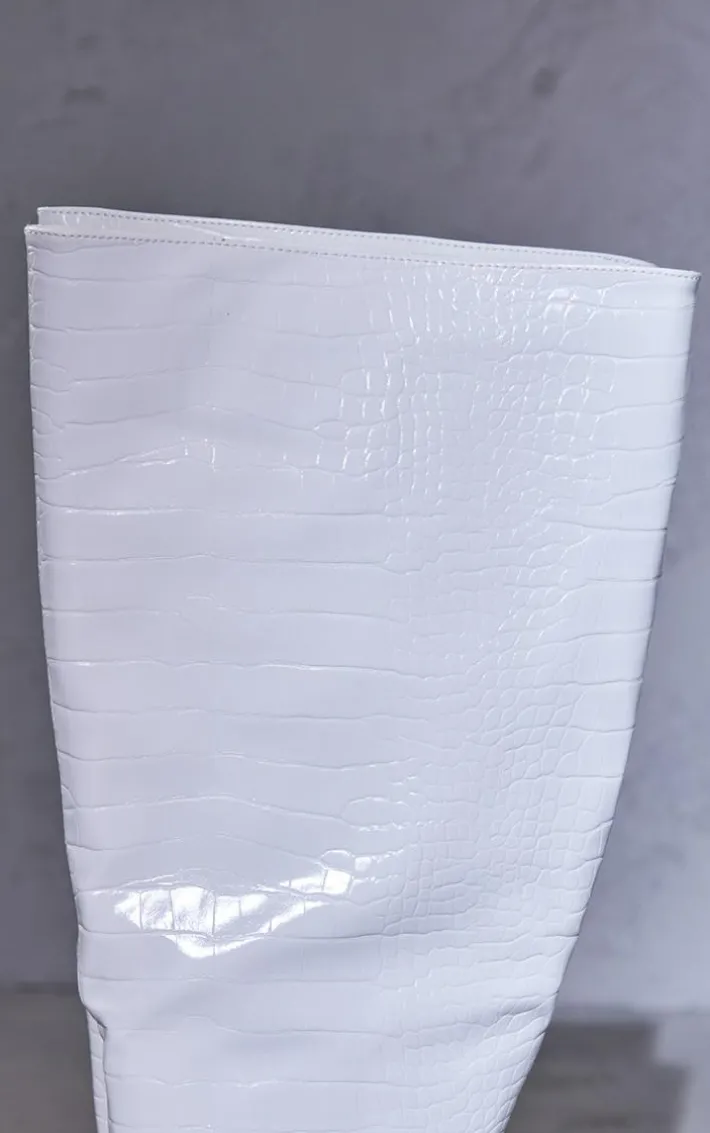Add a little attitude to your new season wardrobe with these boots. Featuring a white PU croc print material with a pointed toe design and a stiletto heel, we’re obsessed.