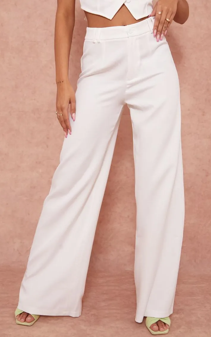 These bottoms are sure to add some fiercely feminine feels to your wardrobe. Featuring a white woven material with a double belted design and a wide leg fit. Team these with the matching suit jacket for a tailored fit.