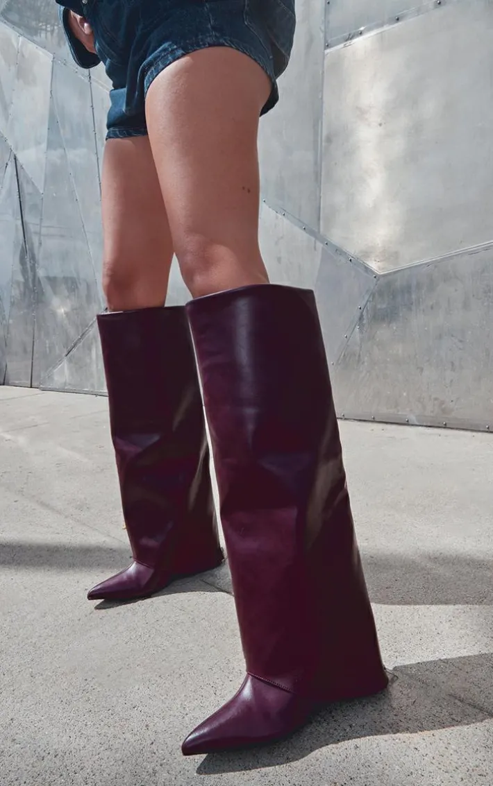 It’s official, we’re obsessed with these wide fit burgundy PU foldover zip detail point toe knee high wedge heeled boots. Brought to you in a burgundy hue PU material with a fold over design, zip detail and point toe, these knee high wedge heeled boots are everything you need and more. Style with your fave outfit of the day for an on-trend finish we can’t get enough of.