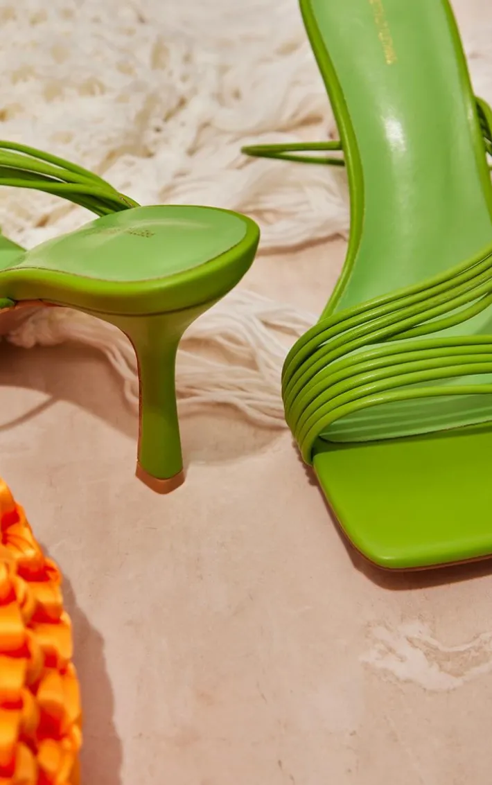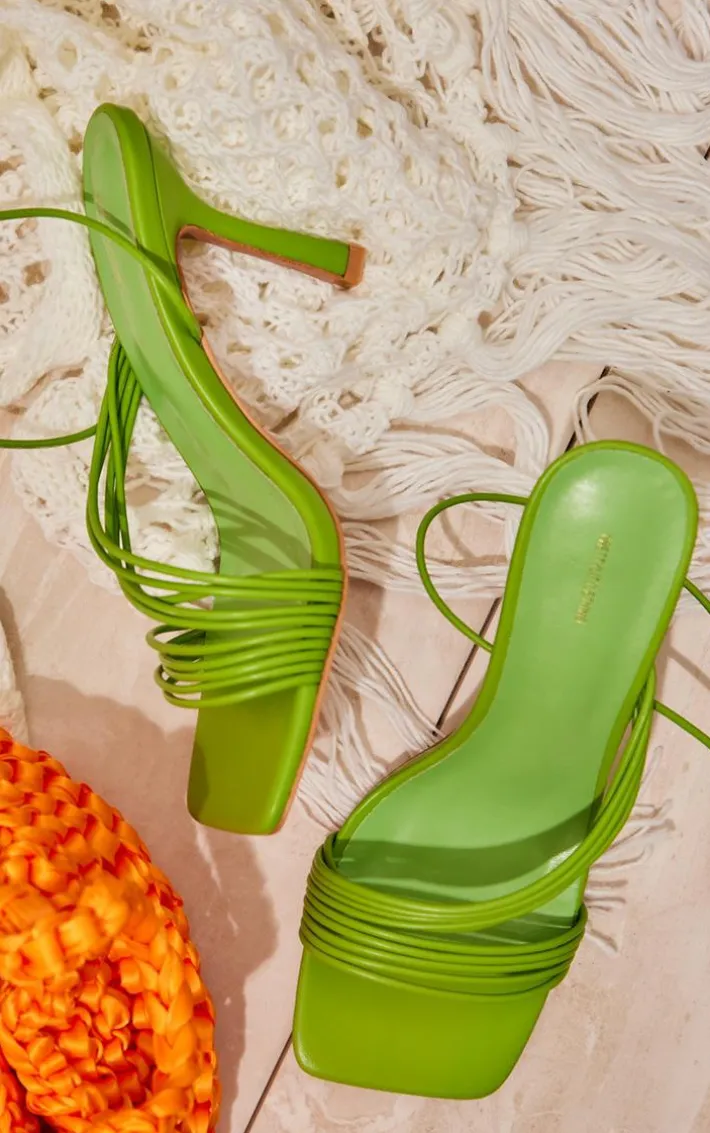 Add a pop of green to your new season wardrobe with these wide fit green PU square toe multi strap asymmetric lace up high heeled sandals, get ready to earn all the style points. Made using a green PU material with an asymmetric multi strap design and a square shape, you won’t be able to resist these heeled sandals. Pair them with your fave weekend fit for a flawless look everyone will love.
