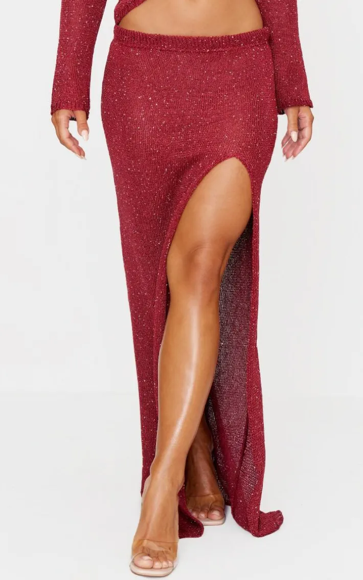 New season skirts have arrived, and this wine sequin knit side split maxi skirt is a must-have. Brought to you in a chic sequin knit fabric with an irresistible wine hue and side split feature, you’ll be entering the room with so much confidence. Shop the look to pair this maxi skirt with the matching top, clear heels and silver drop earrings.